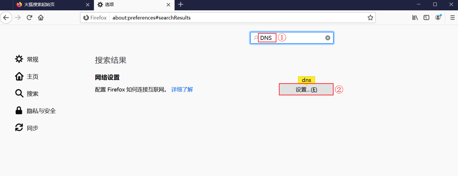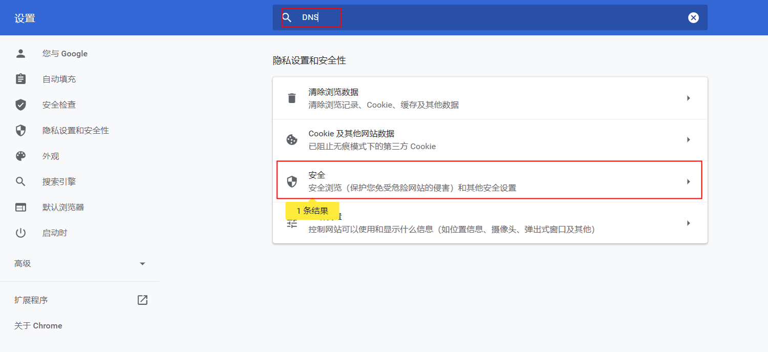 第二步:在搜索框中输入“DNS”,在下方的检索结果中,点击【安全】右侧的展开箭头。