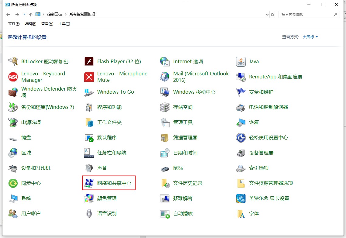 1.打开Windows 10系统控制面板,点击右上角的以图标方式显示,点击“网络和共享中心”选项。