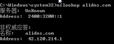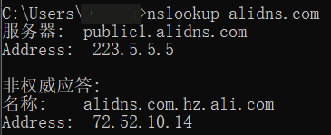 6.验证,打开CMD命令提示符,通过nslookup alidns.com 命令进行验证,若最终解析结果是配置的IPV4公共DNS(223.5.5.5或223.6.6.6)或IPV6公共DNS(2400:3200::1或2400:3200:baba::1)返回的,则说明配置成功。