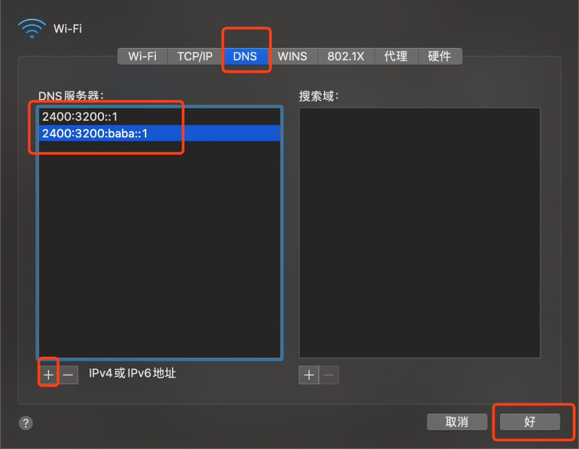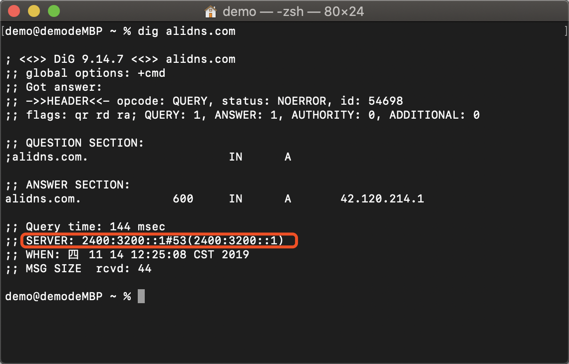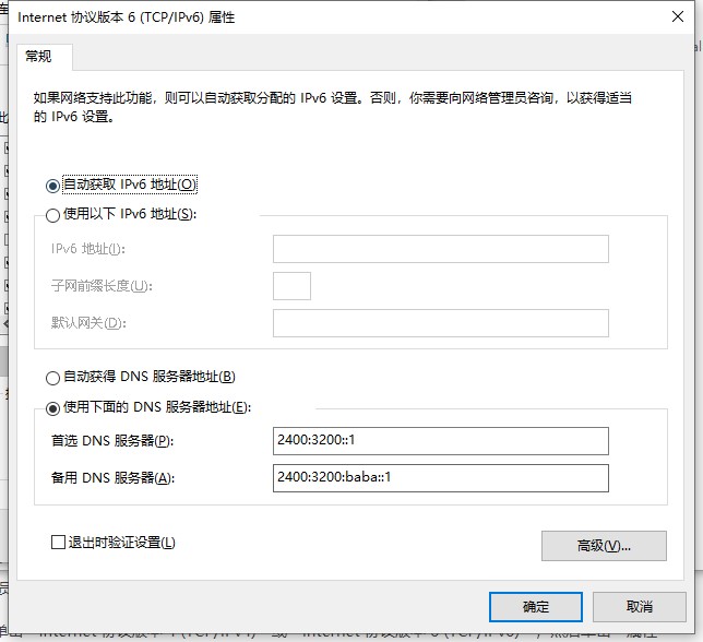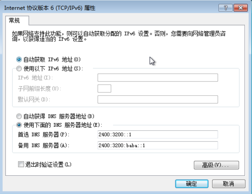 若返回结果的server为阿里公共DNS(2400:3200::1或2400:3200:baba::1)则配置成功。