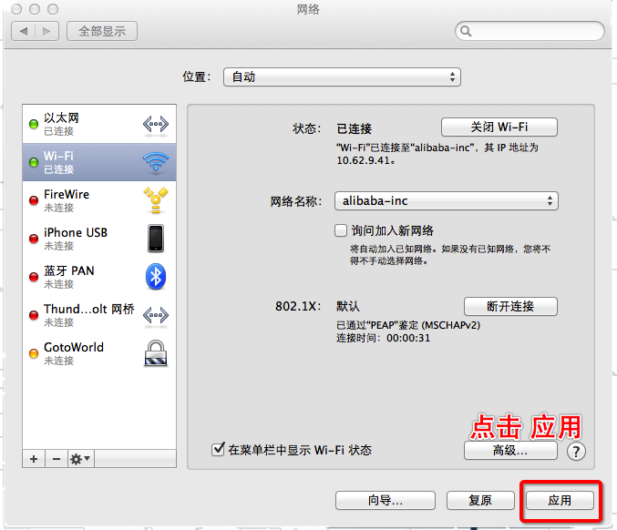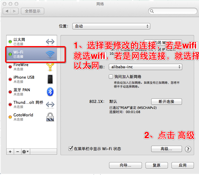 3.从列表中选择想要使用的网络连接服务(例如WIFI或以太网),然后点按“高级”