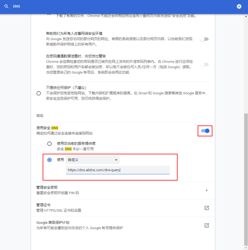 第三步:页面下拉到最下方,在【高级】选项中,开通“使用安全DNS”功能,并在【使用】-【自定义】框中输入“ https://dns.alidns.com/dns-query ”即可完成配置。